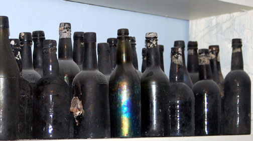 Black glass, mostly squat rum and whisky. Several have a crown embossed on the shoulder.
